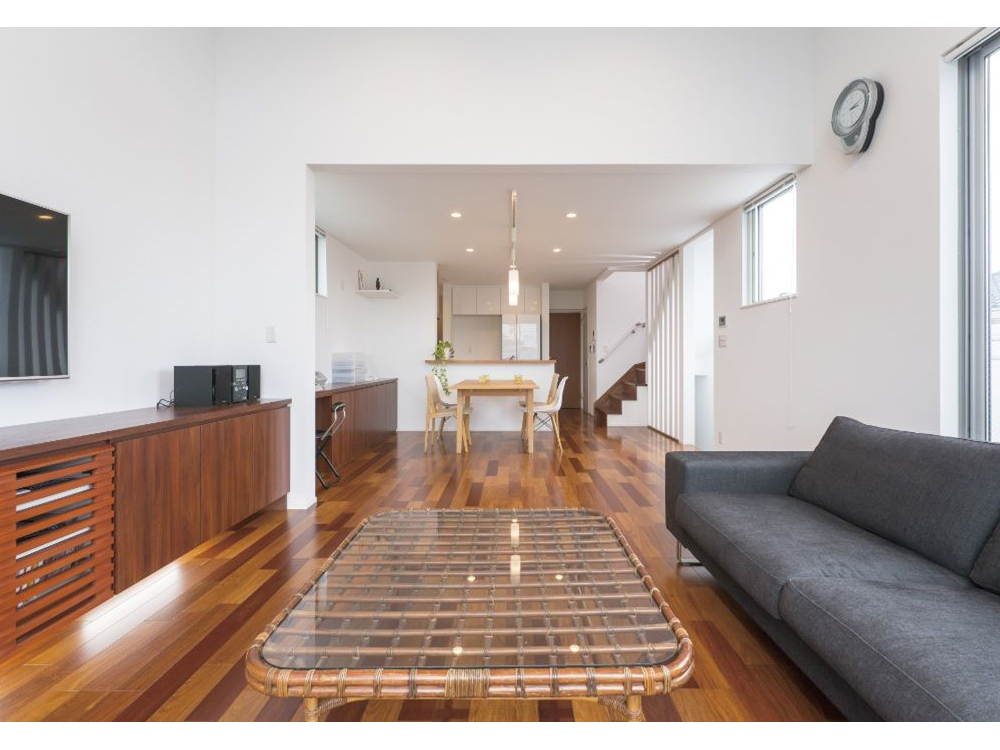 質感のある床材や大空間のリビングなど、設計の方にイメージを伝えるため雑誌の切り抜きなども使って説明した。 内装は白を基調とし、家具を造り付けにしたり、照明にもこだわったり。収納スペースもたっぷりとれて、使い勝手がよく満足している。 集合住宅から一戸建てになり、音漏れを気にしないで済むのが何より。 長期優良住宅仕様にしたことで、光熱費も抑えられている。明るく風通しがよいのも気に入っている。