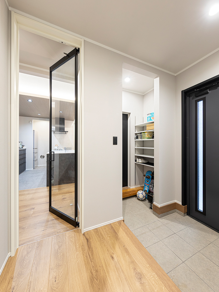 暮らしやすさを考えた工夫も随所に。キッチンにはリビング側からも出入りできる大容量のパントリーを設置。また玄関には家族用のシューズクロークを設け、リビングへ直接行き来できる便利な動線を整えた。